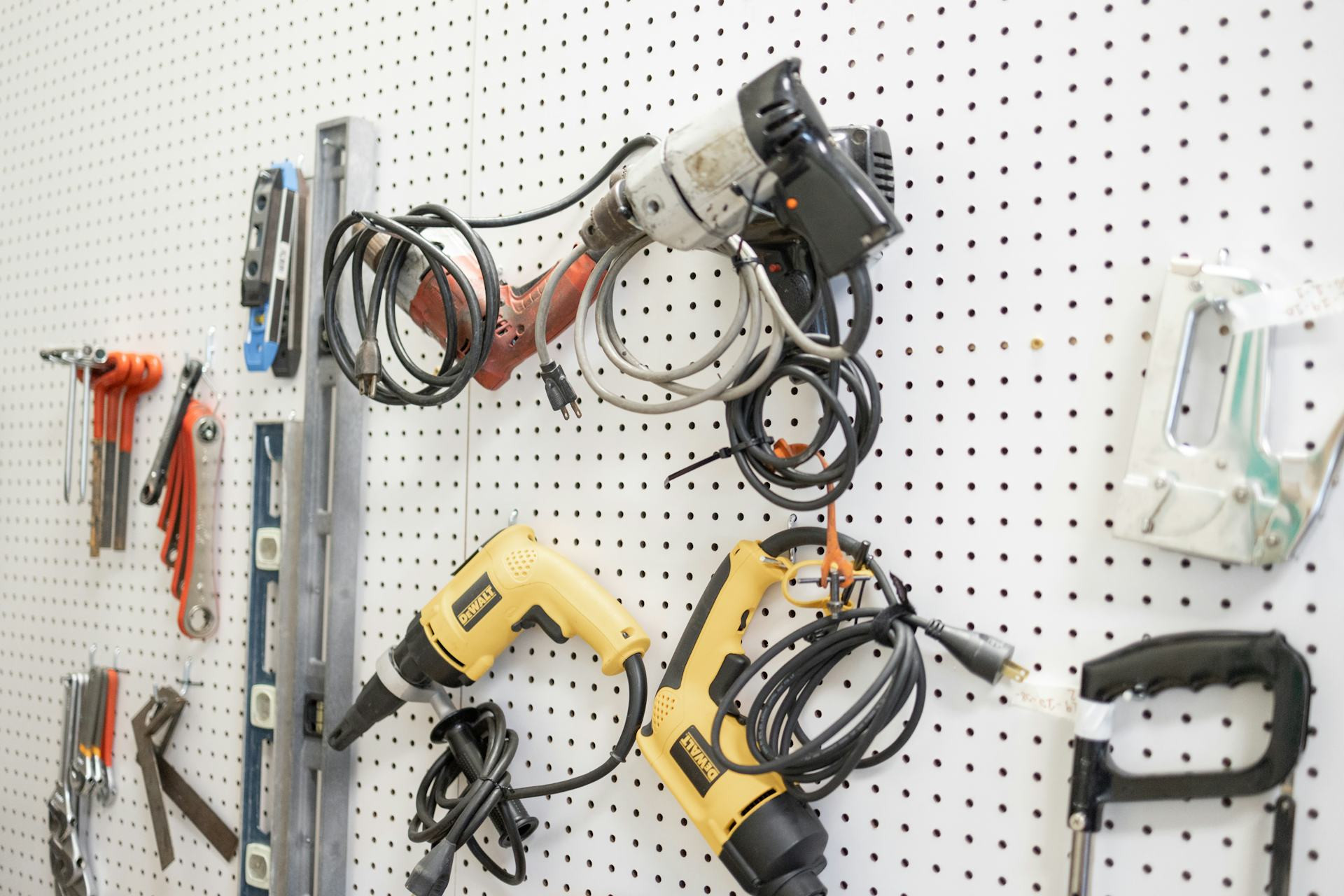 Elværktøj fylder ofte mest og kræver særlige løsninger. Brug solide hylder eller skabe med plads til både maskiner og tilhørende batterier og opladere. En opladningsstation med stikdåse og kabelstyring kan spare tid og holde orden på ledningerne.